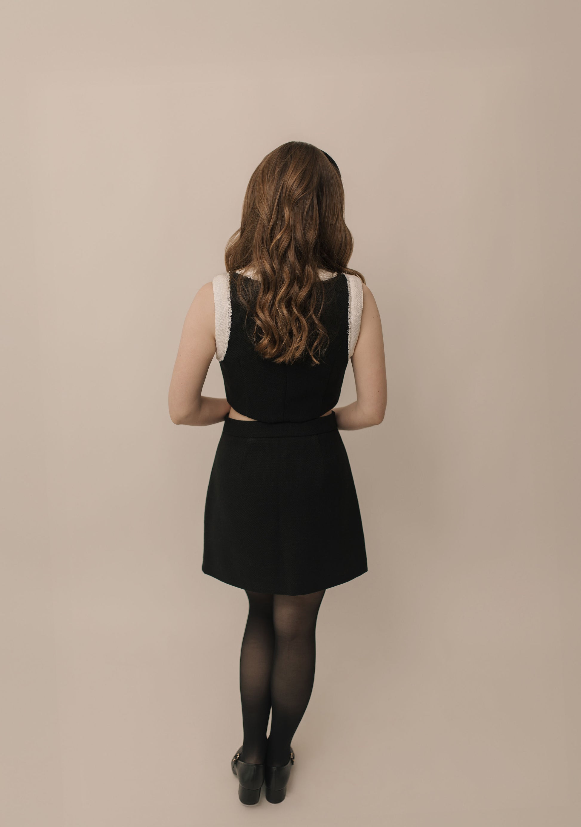 - Contrasting black and white tweed panels