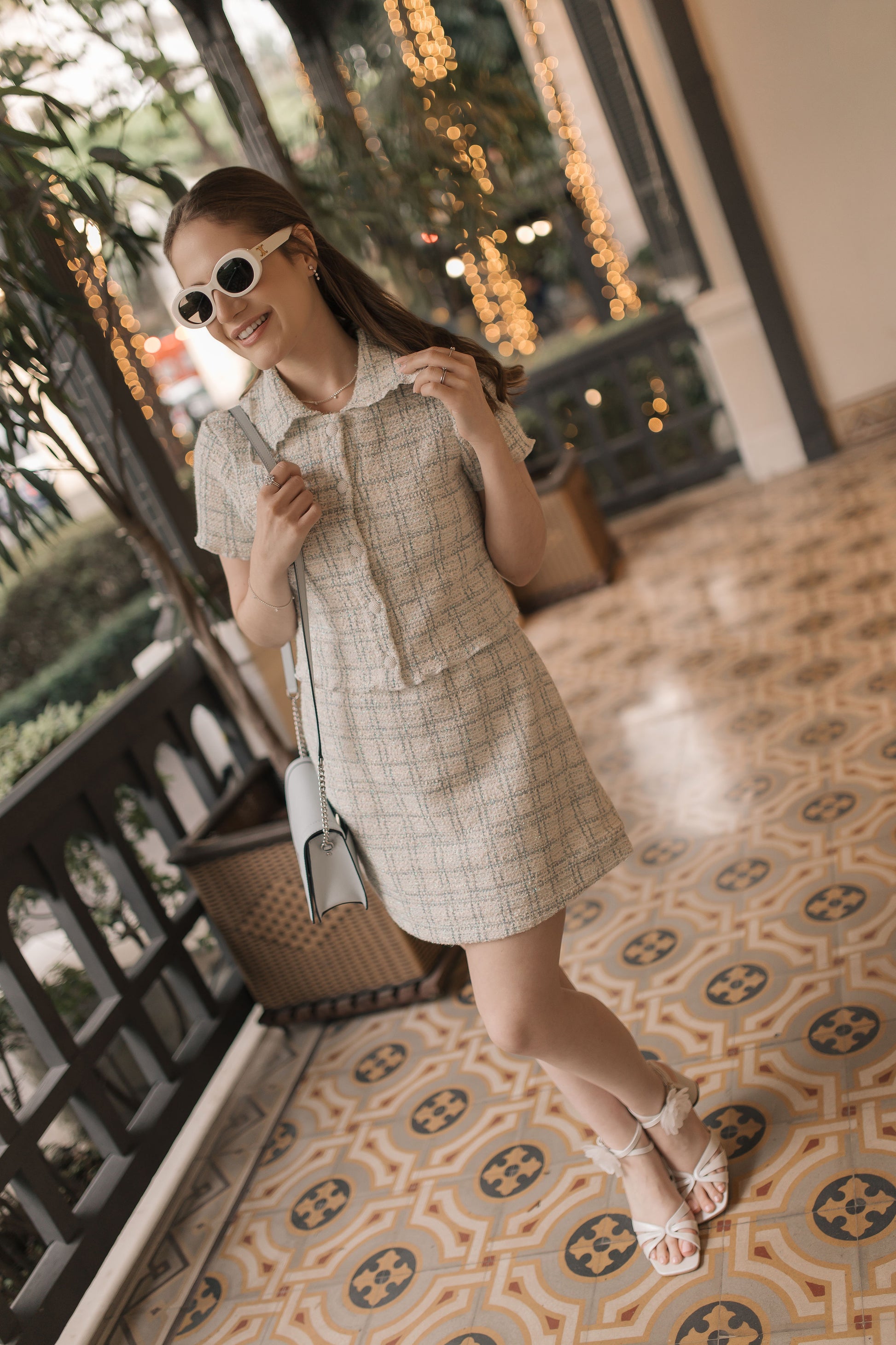 A softly tailored tweed top that brings back romantic memories. Woven in a delicate blue-and-white tweed with subtle sparkle, it’s finished with lustrous pearl buttons and couture-inspired scalloped edges that give the silhouette a polished, charming finish. This style is available in both blue and pink versions.