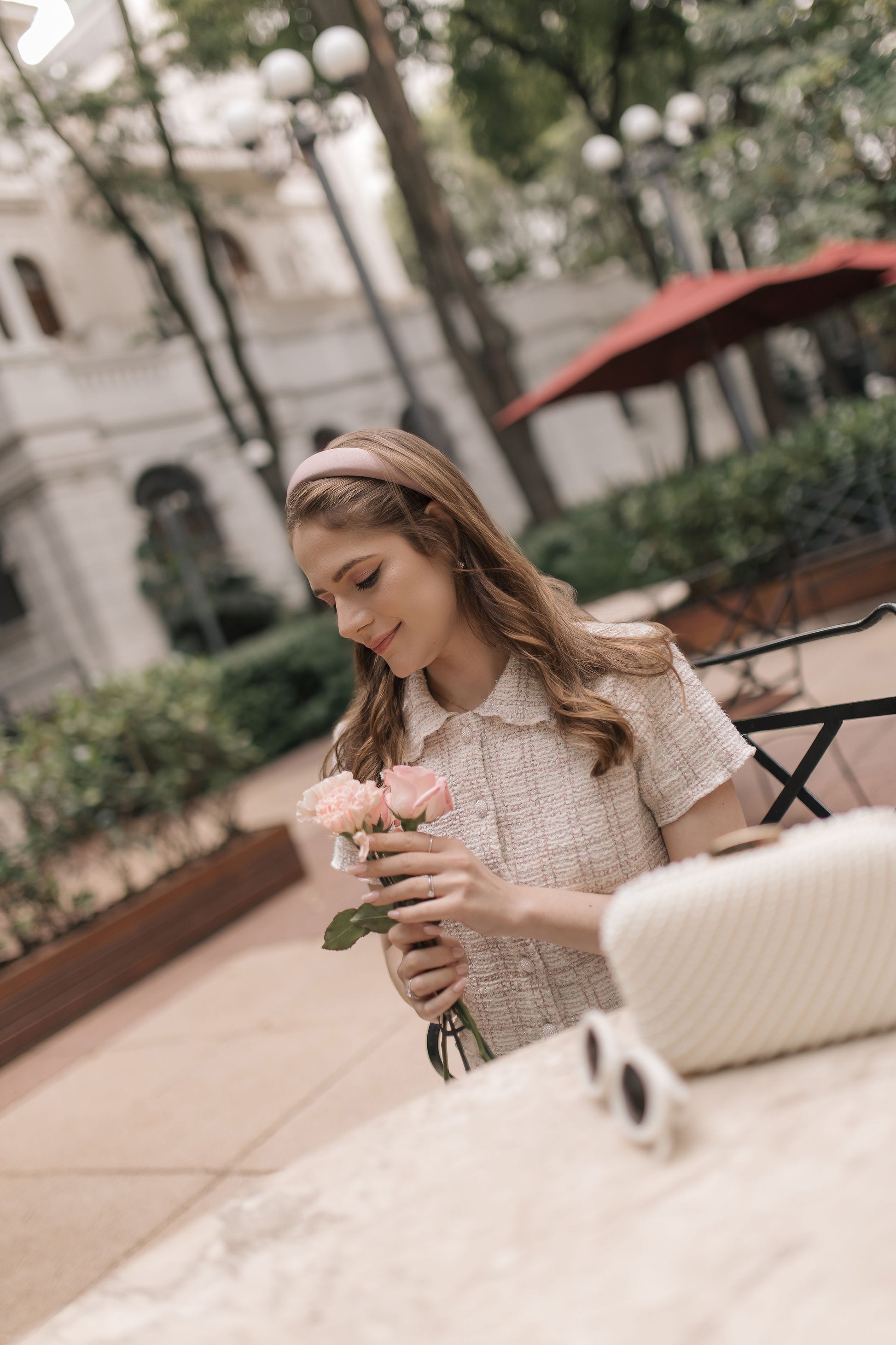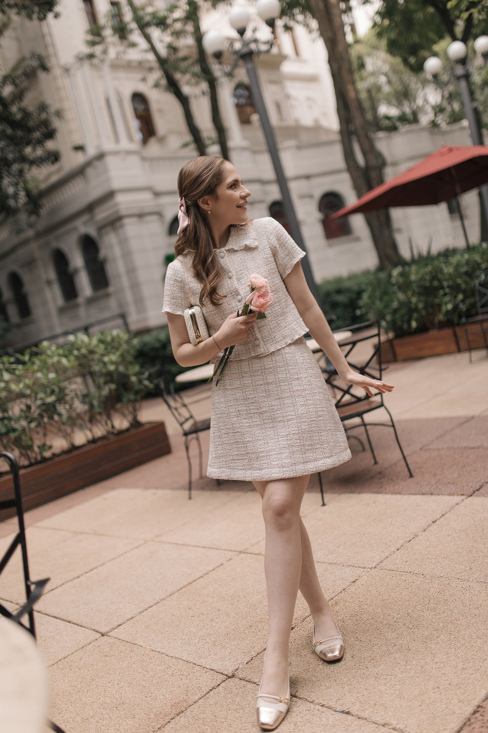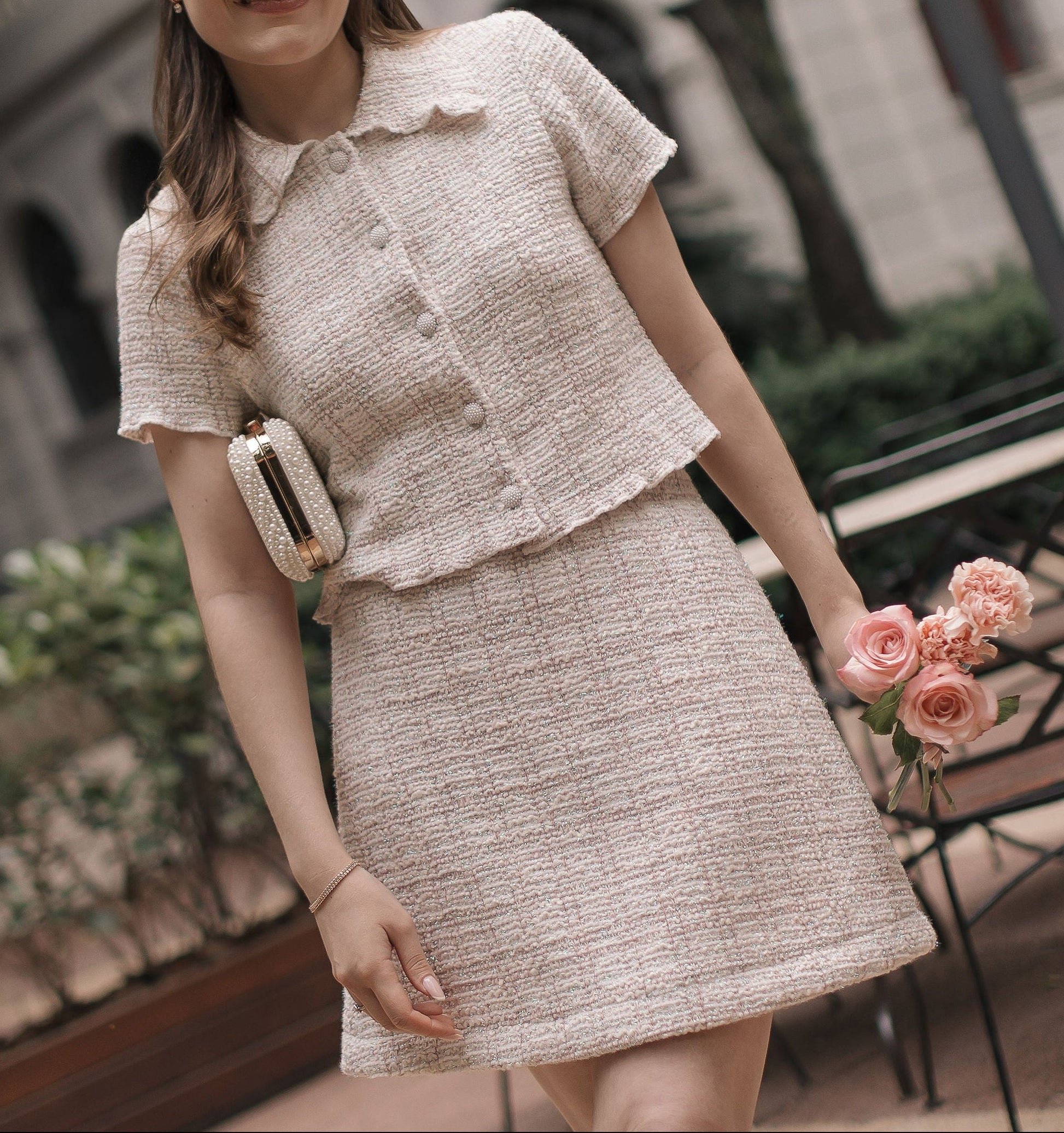A softly tailored tweed top that brings back romantic memories. Woven in a delicate pink-and-white tweed with subtle sparkle, it’s finished with lustrous pearl buttons and couture-inspired scalloped edges that give the silhouette a polished, charming finish. This style is available in both pink and blue versions.